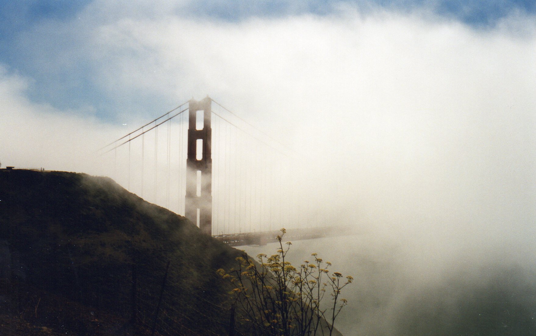We pile into our crimson mini-bus for a city tour. Sprawling satellite towns spread into the distance below the Twin Peaks. Mist swirls around us, blotting out parts of it. We can hardly see the Golden Gate Bridge. We motor over the Bridge and park above it to catch glimpses between the clouds, caused by a cold Arctic current meeting the warm ocean; but we see no gold. We march for forty minutes across the length of the Bridge, the incessant four lanes of traffic booming by on our right. Boat foghorns echo mournfully as they pass beneath us in the mist.