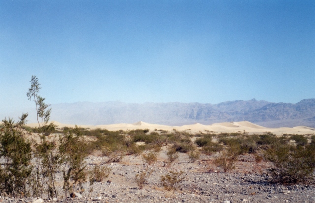 We break camp after an early rise to get through Death Valley before it becomes too hot. A long hot day – endless straight roads. Low scrub, salt pans, Joshua trees, high mountain ranges in varicoloured hues; lava folds and cracks, like parts of the Rift Valley, but more bleak and lifeless. Endless salt flats like those found at LakeMagadi, but on a bigger scale. Heat 100 degrees in the shade (the record is 134 degrees). Thank goodness for the air-conditioned bus. We drive below sea level. An extraordinary place.