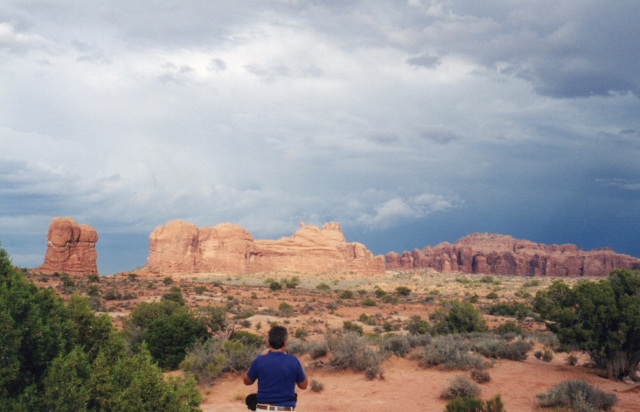 We broke camp and headed northwards, east, and then south to Moab – a long eight hour drive through varied scenery. Farms, rolling prairie, forest beginning to turn into autumn colours, mesas creating fortress after giant fortress on the skyline. A geologist’s heaven. We lunched at a small restaurant with sunflowers poking their heads through the windows. I bought a neckerchief there, depicting cowboys and horses in a sunset; and there were many beautiful trinkets for sale.