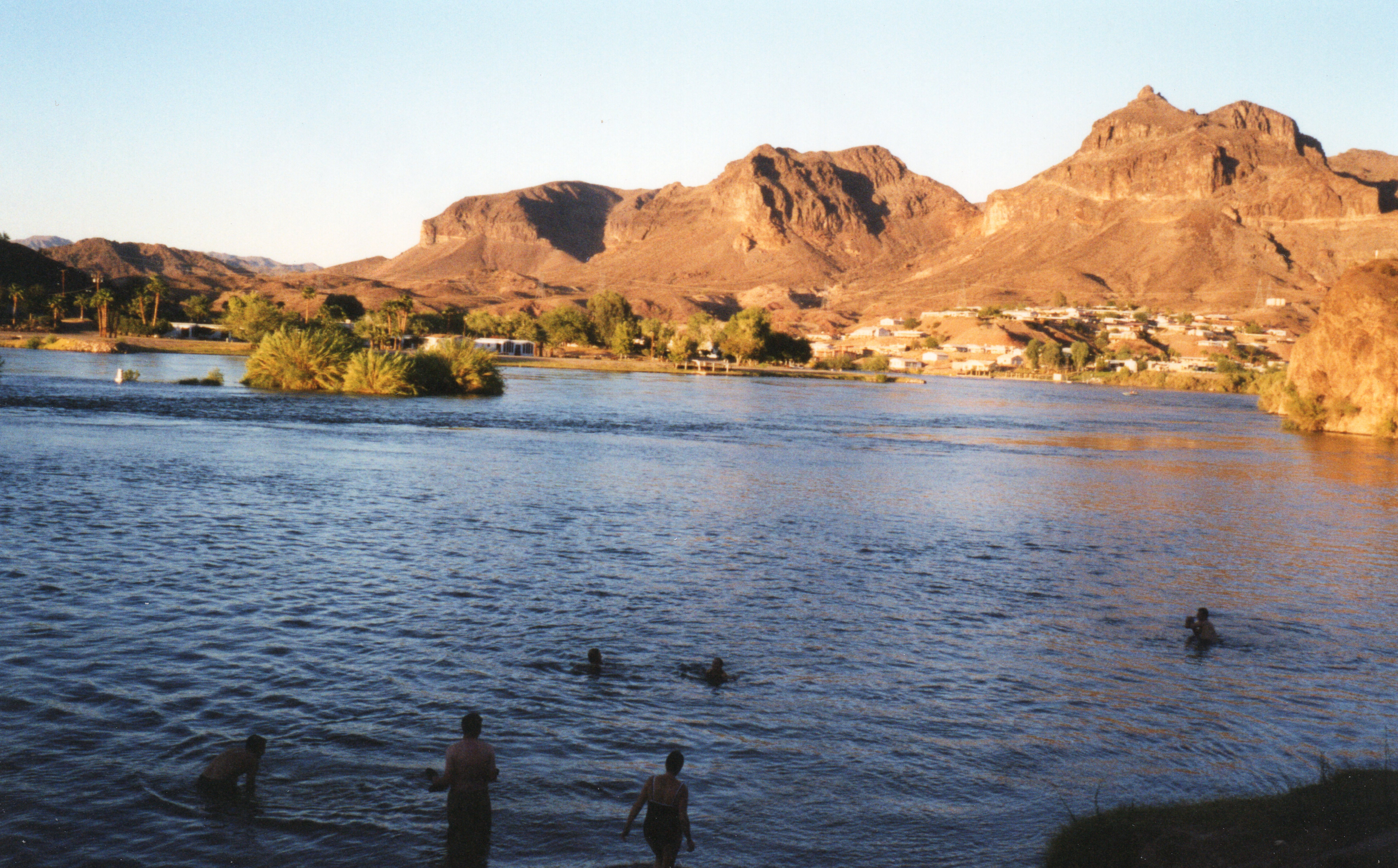 Just fifteen miles further on we turn into an idyllic campsite. Green spongy grass, a sleepy curve in the Colorado River, and only one other camper in sight. We soon disturb the peace, aided by a couple of noisy jet-skiers. Splashing and playing in the cool waters, we wash our fly-sheets and groundsheets and sit down to a final delicious meal cooked by Jane: risotto this time, followed by blueberry pie, fruit and cream. Let me say at this point that throughout our trip we shared camp duties, (cooking, table-setting, and washing-up), strictly organised by Jane on a “roster” none of us really tried to read or fully understand. But as no less than six people were on duty at a time, the burden was light.