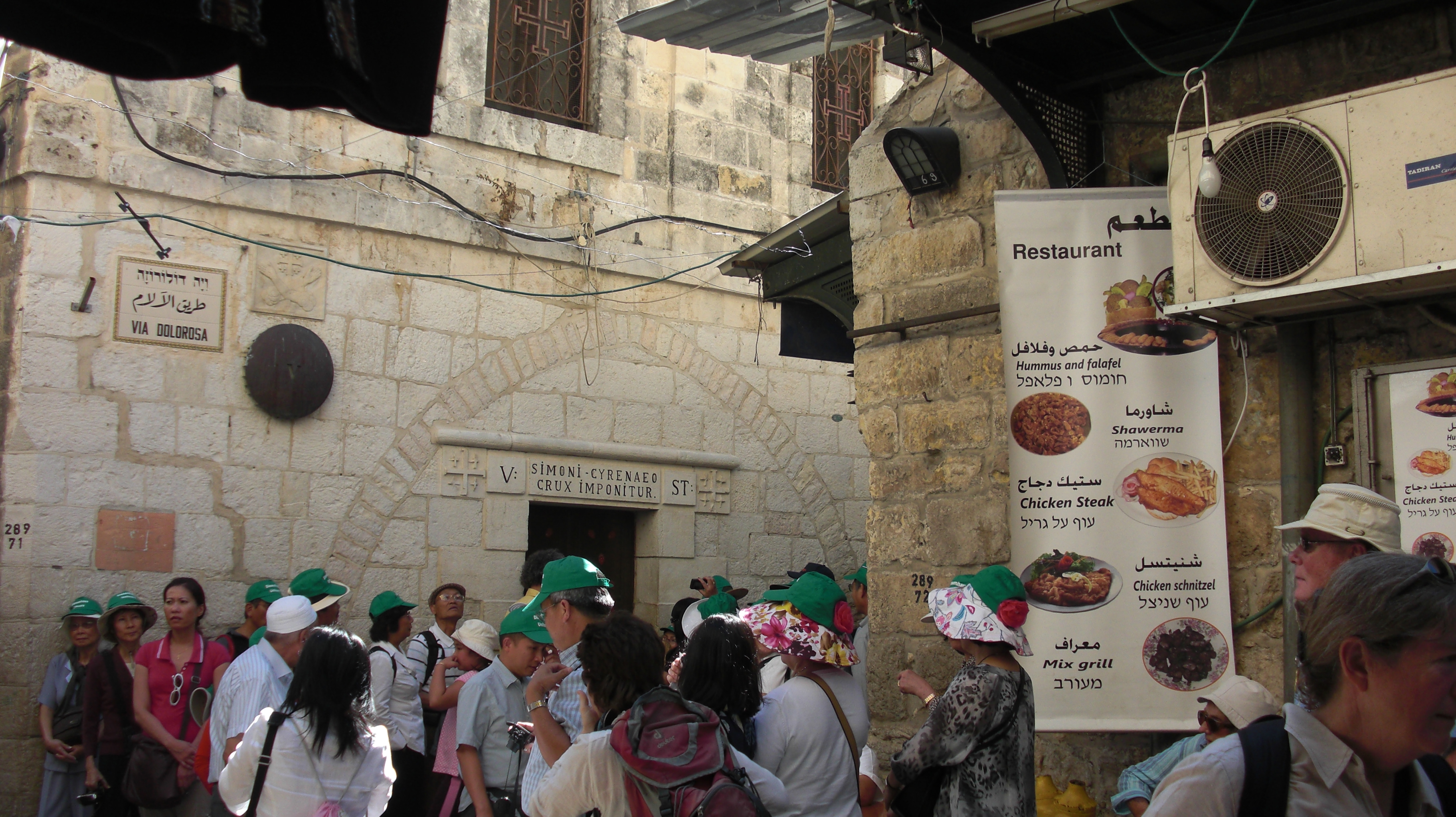 Chapels of many differing denominations line the Via Dolorosa; the devout try to pray in the melee; some groups wearing green caps stand out.