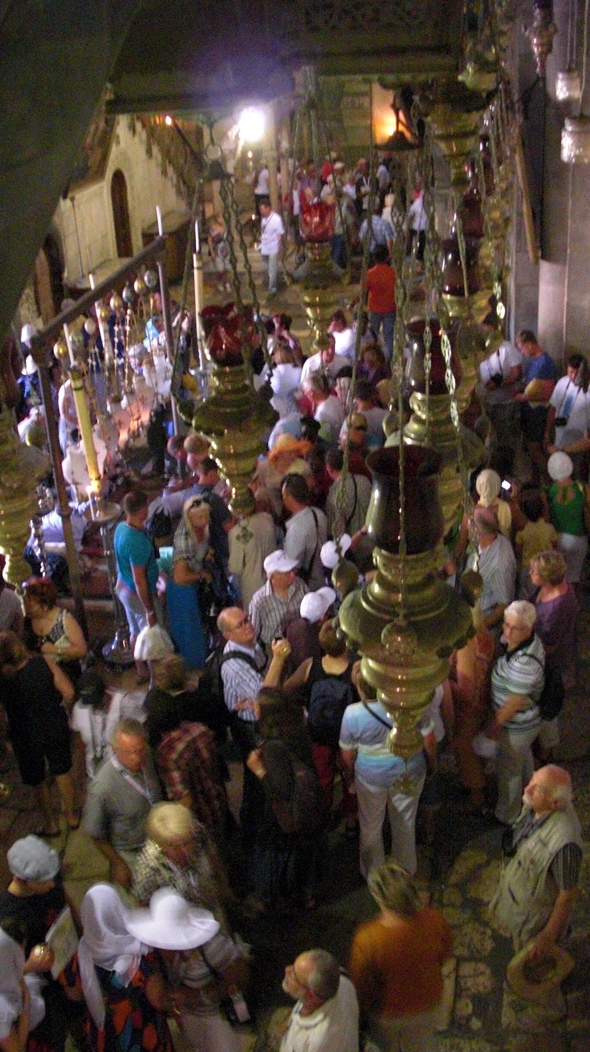 The Church of the Holy Sepulchre was a vibrant mass of people clothed in the colours of all nations. Several clergy led their groups in prayer, others watched from the side. Tour guides waving banners pushed through the throng to make way for their followers, calling in many languages over the clamour as they shouted their spiel. Winding queues of humanity waited to perform obeisance, obliterating the holiness of the surroundings through sheer force of numbers.