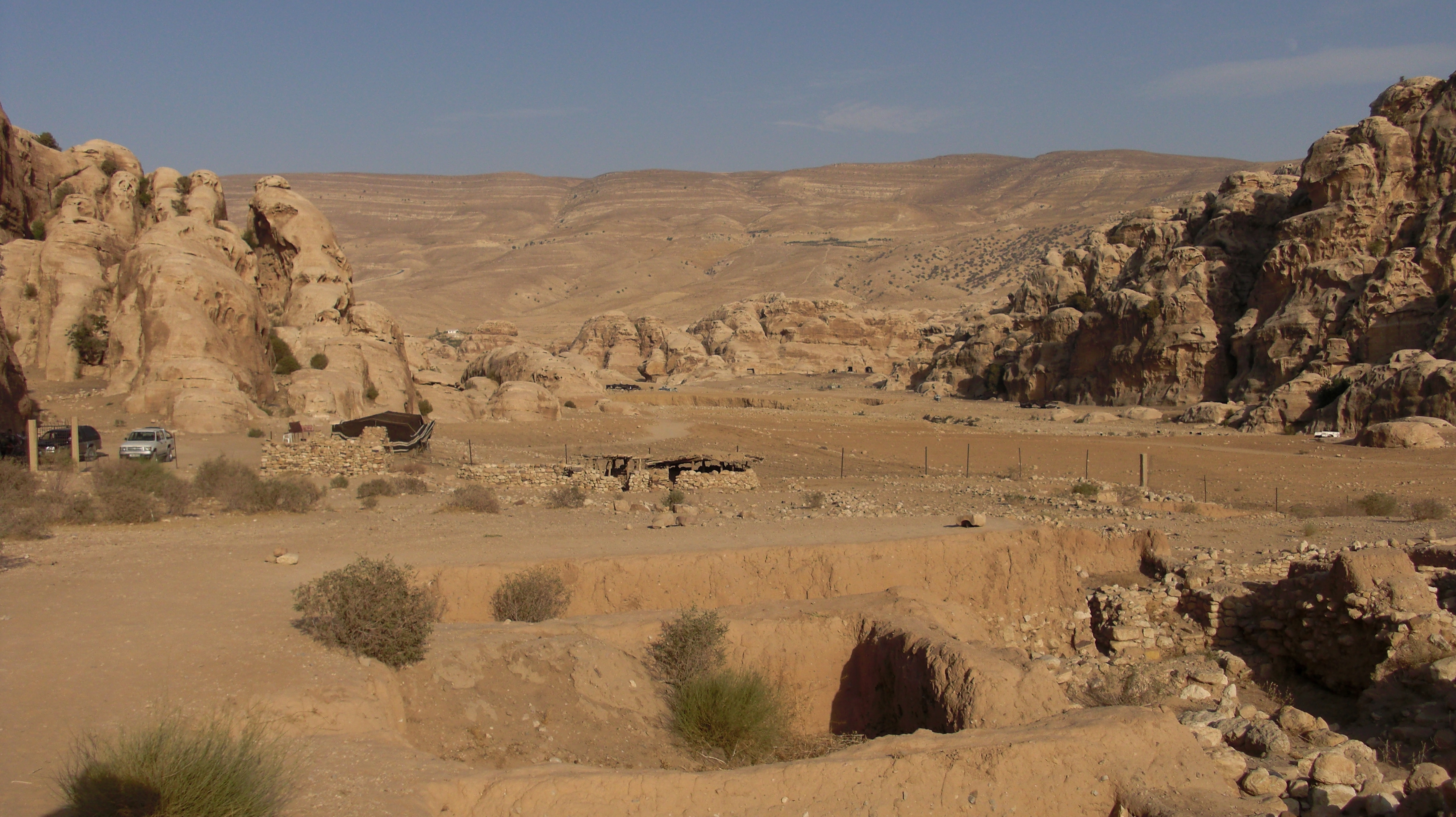 Old Petra, the Bayda Neolithic Village flourished around 7000 – 6500 BC, with some archaeological finds dating to the 10th millennia BC. It was a town of little people, for its stone rooms (in the foreground) are tiny. Beyond is a harrowed field, ready for planting barley when the winter rains come.