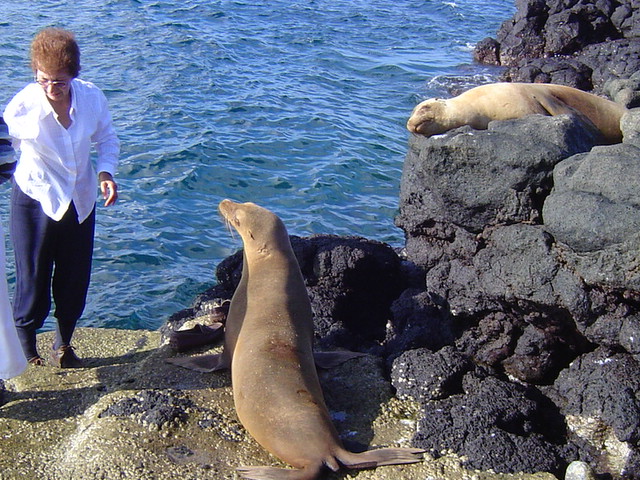We join the queue at the landing stage, waiting for our transfer back to the Guatanamera. The sea lions are still in occupation, and everyone has to negotiate perilously slippery rocks before getting into the landing craft.
