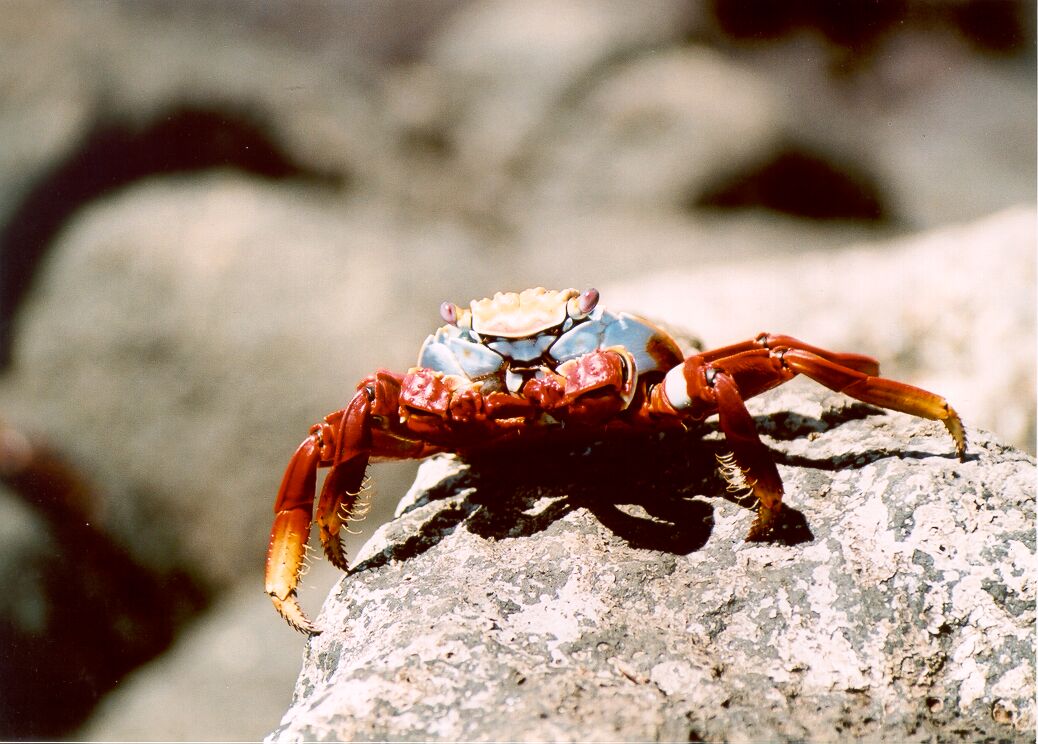 A customary pause on the beach while Billie waits to see where the other tours are heading. Then he leads us away to the left, to do the circuit backwards at our own pace. We stop in the only shade on the island while he tells another story, this time about the sally lightfoots, great orange crabs which cover the rocks in their millions.