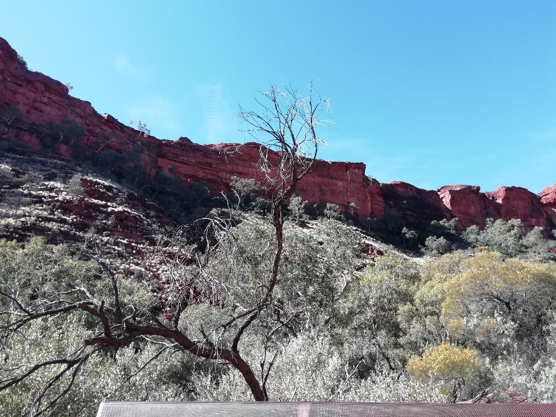 A 305 km drive, with a stop for lunch, to Kings Canyon. Our driver chatted as he drove, punctuated by his mantra “… you know – that sort of thing.” He pointed out the desert oak trees (of casuarina family) which send down tap roots to support and water the larger canopies up to 500 years old. Fire and lightning often destroy the mature trees, but there are plenty of 90-year-old younger “shoots” in evidence.