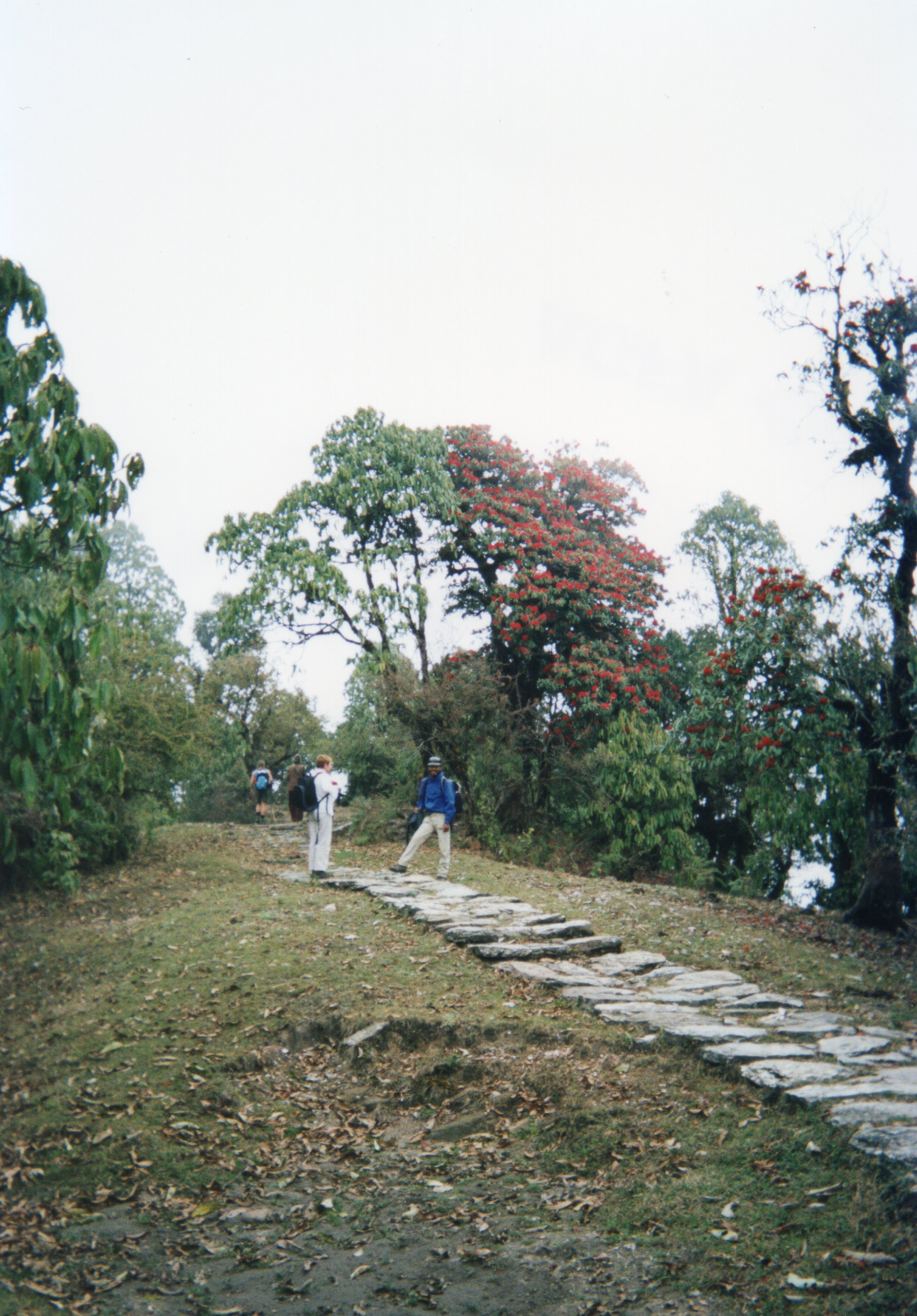 Shops come in clusters. First, camping and climbing gear shops, interspersed with internet cafes at the astonishing price of R1 per minute (R100 = approx. £1). Then carpet shops, wool stores and an occasional corner temple. Grain shops display lentils and cooked rice flakes, with fresh spices. We come to a street colourful with vegetables: succulent carrots, cauliflower, broccoli, onions, potatoes, egg-plant, chillies, sweet corn. There is a gleaming corner of brass and copper ware, intriguing carvings of gods and goddesses, bulls, horses, bangles, silk purses, necklaces and knick-knacks.